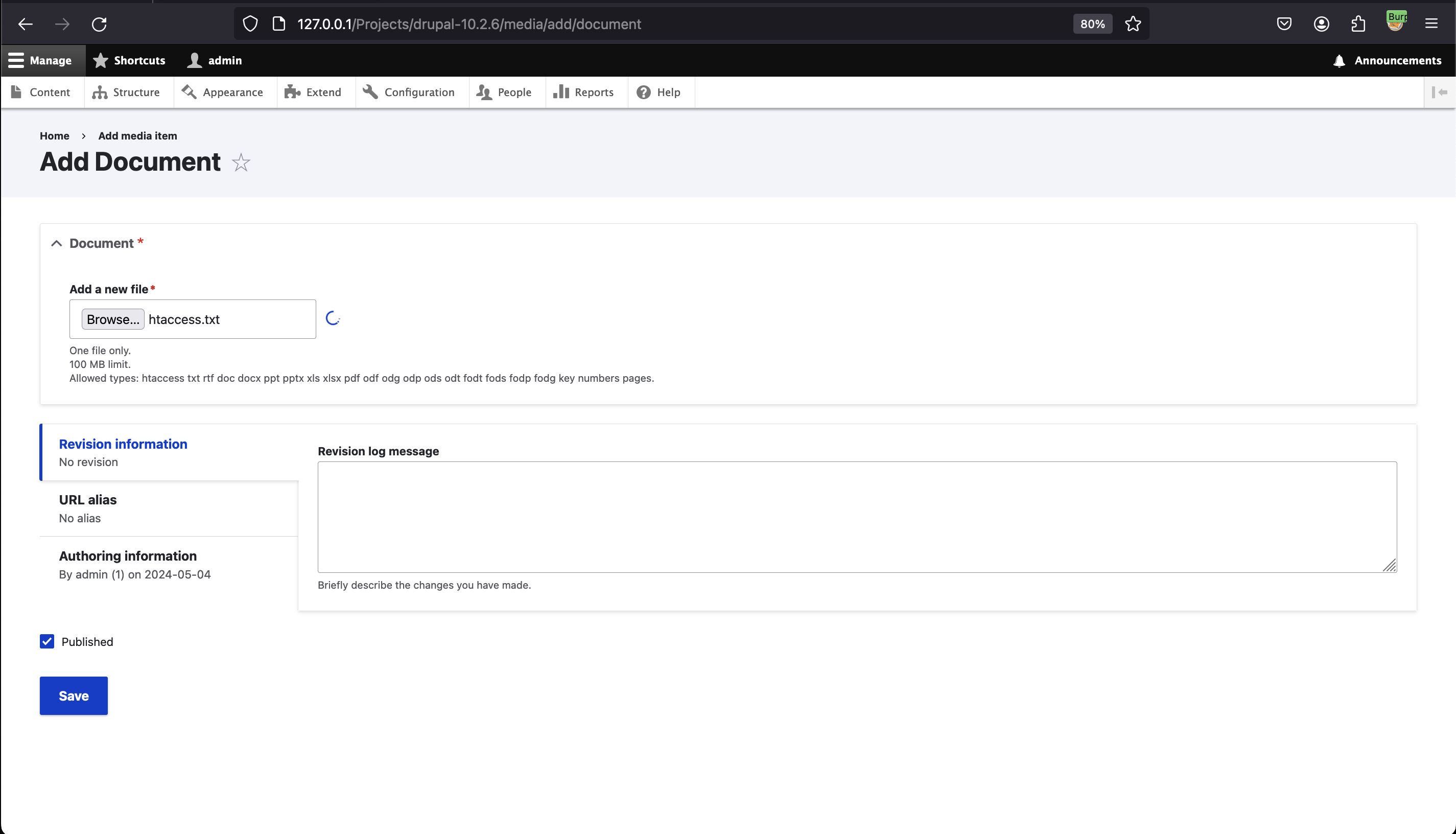 Primeiro, aproveitamos o recurso _Add Document_ (/media/add/document) para fazer o upload do nosso arquivo contendo as diretivas do Apache (.htaccess).
