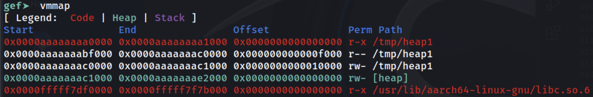 보시다시피, 이는 바이너리가 메모리에 로드된 직후에 위치합니다 ( `[heap]` 섹션을 확인하세요):