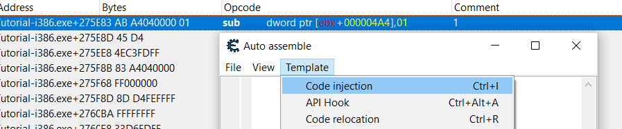 Στη συνέχεια, κάντε κλικ CTRL+a για να καλέσετε το παράθυρο Auto assemble και επιλέξτε Template --> Code Injection