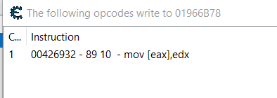 Μόλις επιλέξετε μία από αυτές τις επιλογές, ο debugger θα συνδεθεί με το πρόγραμμα και θα εμφανιστεί ένα νέο κενό παράθυρο. Τώρα, παίξτε το παιχνίδι και τροποποιήστε αυτή την τιμή (χωρίς να επανεκκινήσετε το παιχνίδι). Το παράθυρο θα πρέπει να γεμίσει με τις διευθύνσεις που τροποποιούν την τιμή: