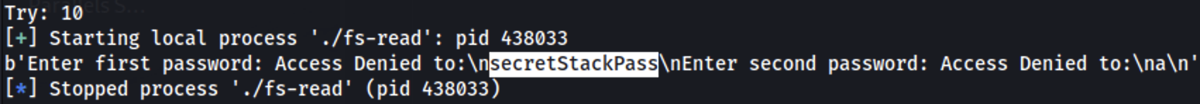 The stack_password will be stored in the stack because it's a local variable, so just abusing printf to show the content of the stack is enough. This is an exploit to BF the first 100 positions to leak the passwords form the stack: