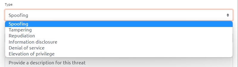 Keep in mind that there is a difference between Actor Threats and Process Threats. If you would add a threat to an Actor then you will only be able to choose "Spoofing" and "Repudiation. However in our example we add threat to a Process entity so we will see this in the threat creation box: