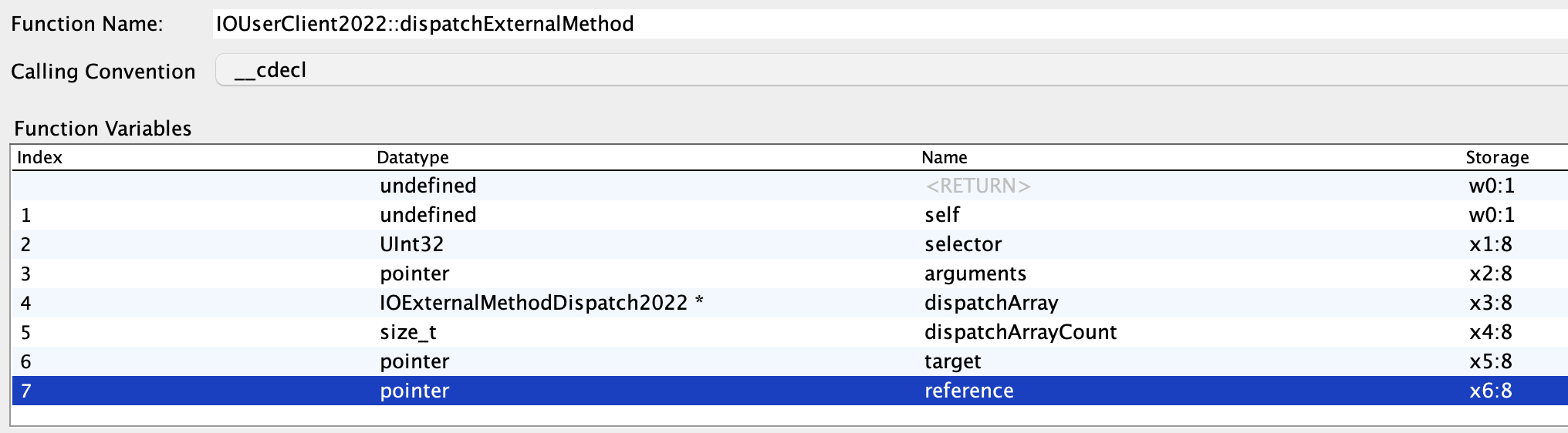 For the next step we need to have defined the IOExternalMethodDispatch2022 struct. It's opensource in https://github.com/apple-oss-distributions/xnu/blob/1031c584a5e37aff177559b9f69dbd3c8c3fd30a/iokit/IOKit/IOUserClient.h#L168-L176, you could define it: