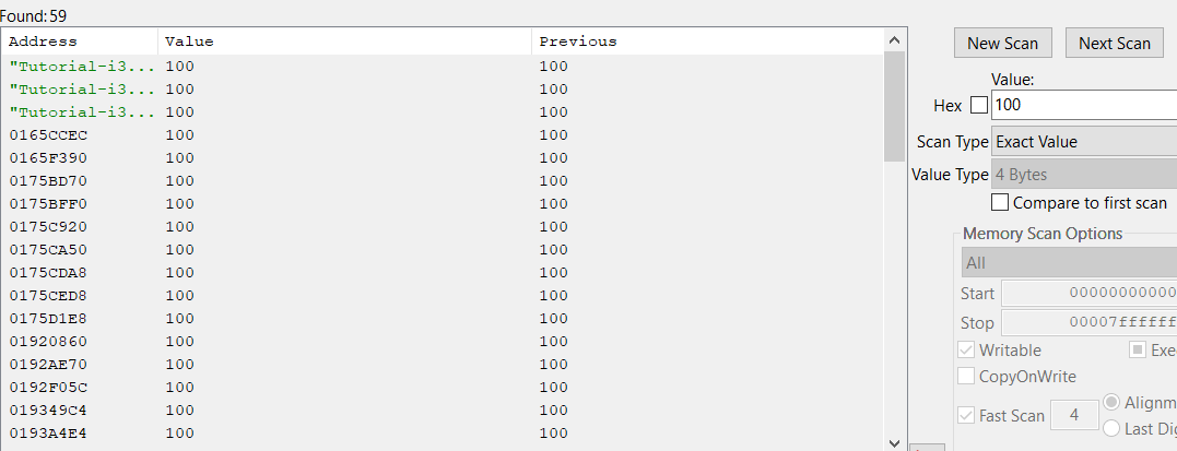 Cheat Engine will search for the values that went from 100 to the new value. Congrats, you found the address of the value you were looking for, you can now modify it.