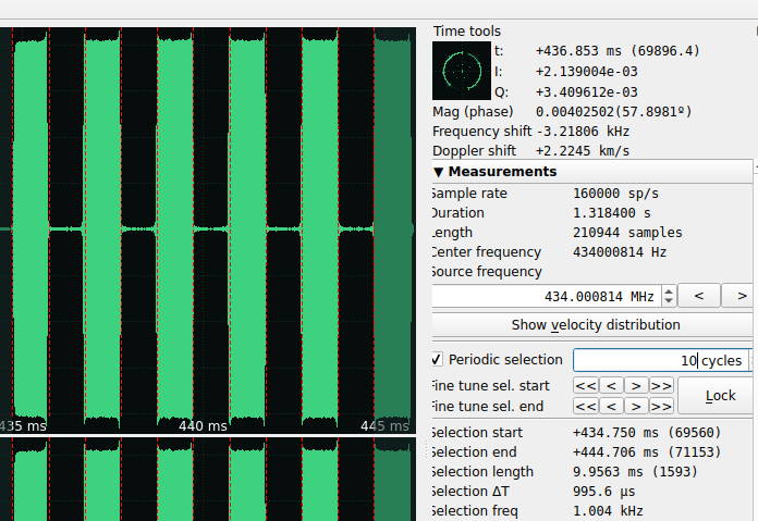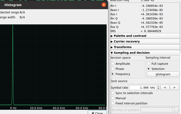 You can also indicate the number of symbols you are going to select and SigDigger will calculate the frequency of 1 symbol (the more symbols selected the better probably). In this scenario I selected 10 symbols and the "Selection freq" is 1.004 Khz: