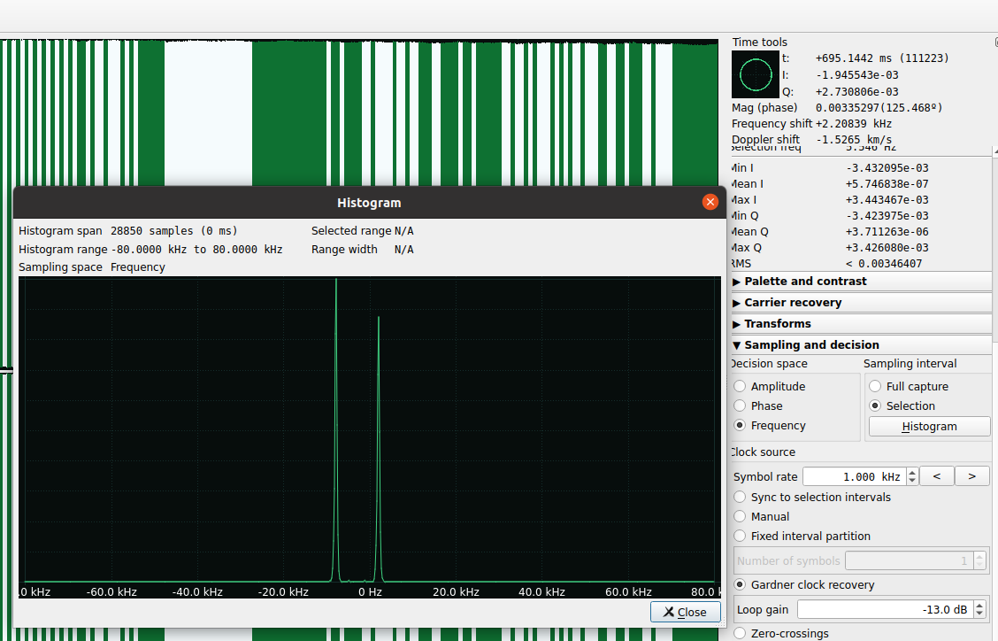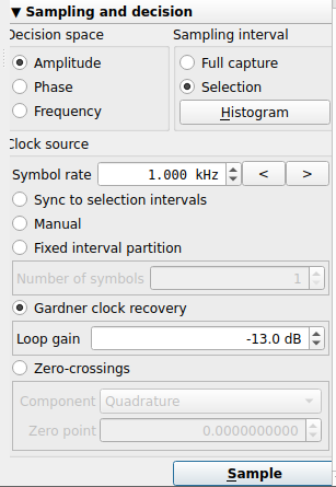 Having found this is an AM modulated signal and the symbol rate (and knowing that in this case something up means 1 and something down means 0), it's very easy to obtain the bits encoded in the signal. So, select the signal with info and configure the sampling and decision and press sample (check that Amplitude is selected, the discovered Symbol rate is configured and the Gadner clock recovery is selected):