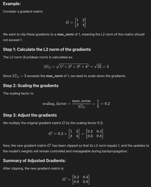Gradient clipping is a technique used to enhance training stability in large neural networks by setting a maximum threshold for gradient magnitudes. When gradients exceed this predefined max_norm, they are scaled down proportionally to ensure that updates to the model’s parameters remain within a manageable range, preventing issues like exploding gradients and ensuring more controlled and stable training.