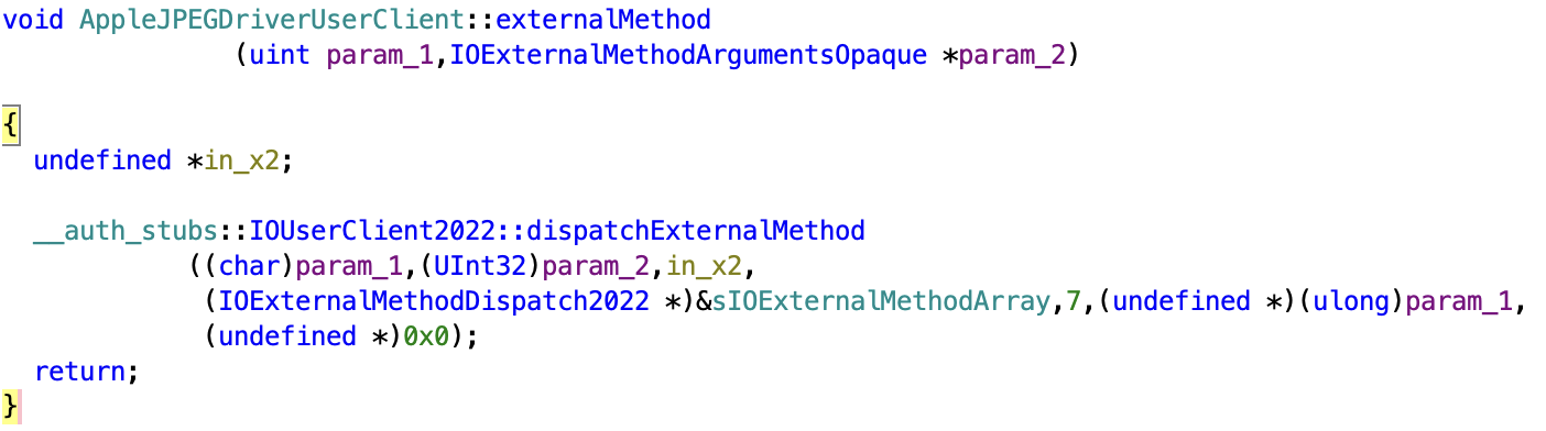 IOUserClient2022::dispatchExternalMethod(self, unsigned int, IOExternalMethodArgumentsOpaque*, IOExternalMethodDispatch2022 const*, unsigned long, OSObject*, void*)