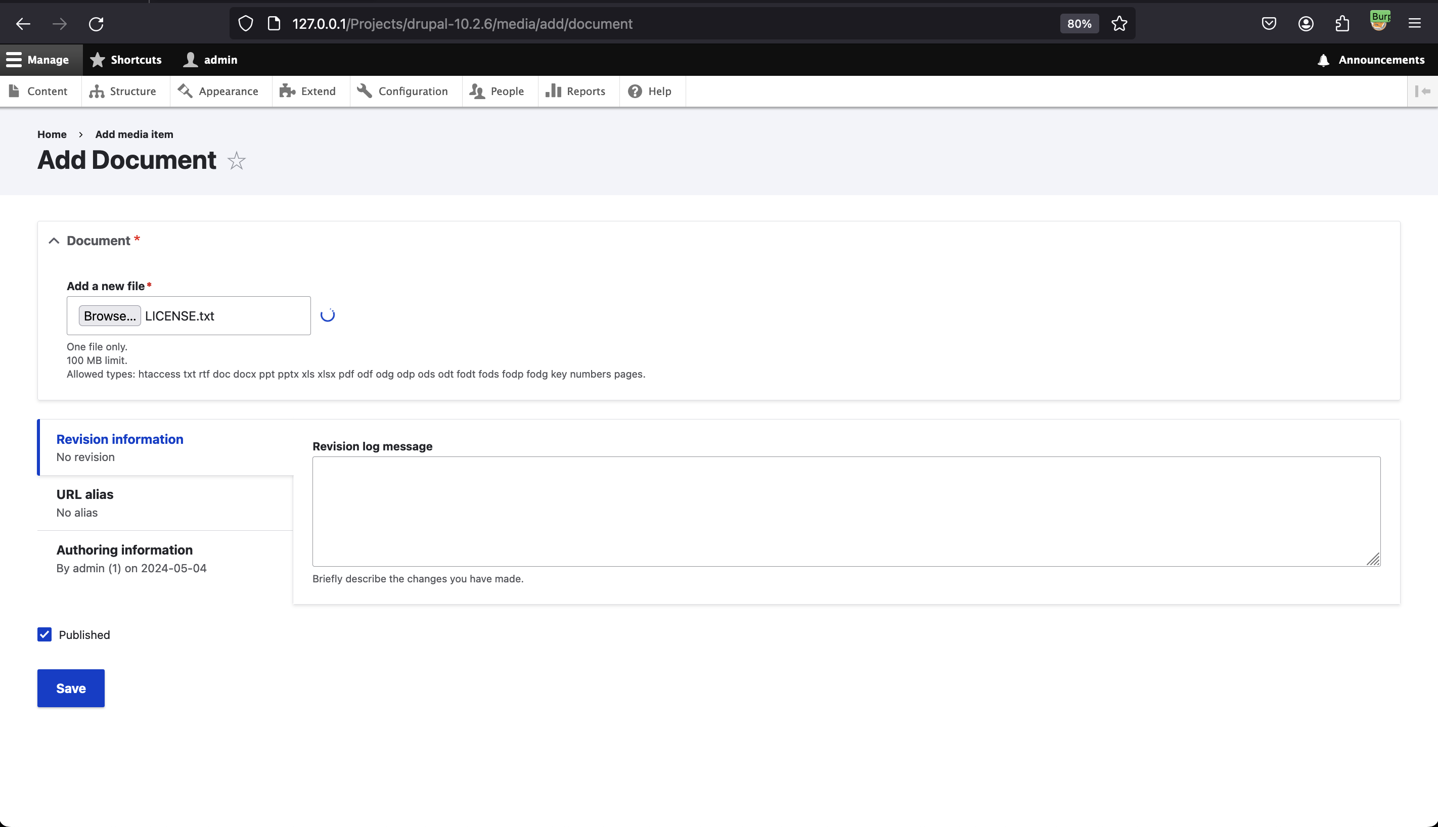 Zuerst nutzen wir die Funktion Dokument hinzufügen (/media/add/document), um unsere Datei mit den Apache-Direktiven (.htaccess) hochzuladen.