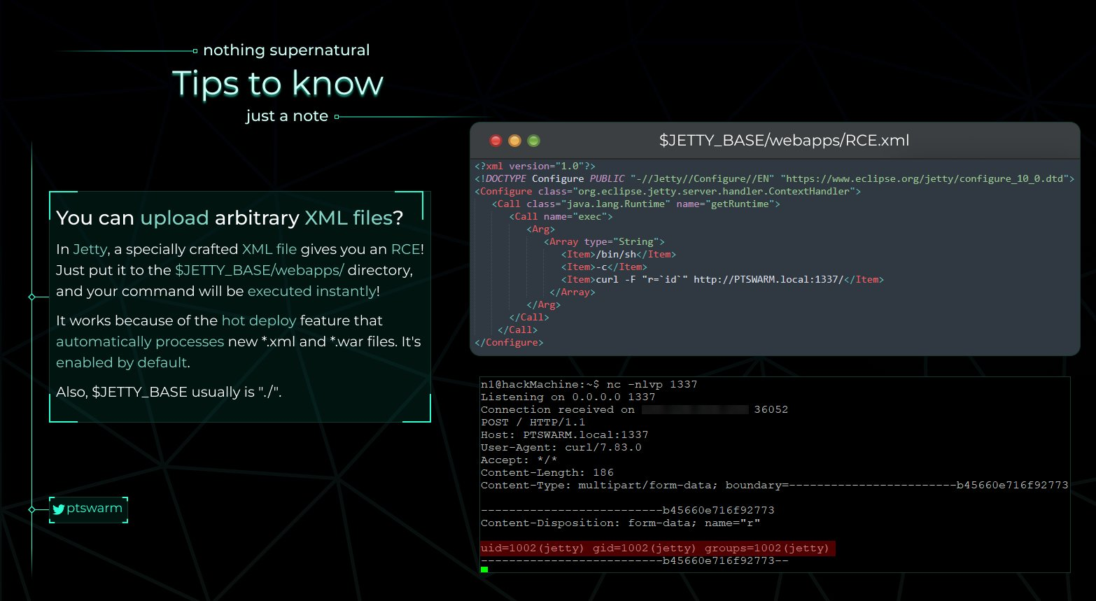 Wenn du eine XML-Datei auf einen Jetty-Server hochladen kannst, kannst du RCE erhalten, weil neue *.xml und *.war automatisch verarbeitet werden. Wie im folgenden Bild erwähnt, lade die XML-Datei in $JETTY_BASE/webapps/ hoch und erwarte die Shell!