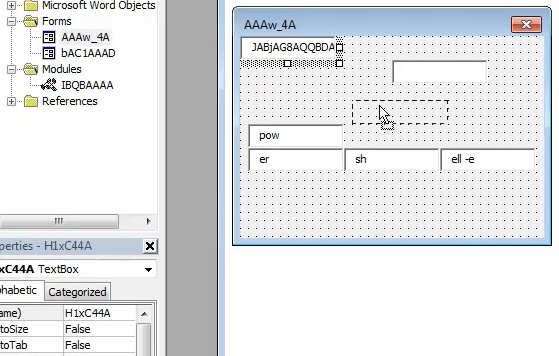 Kwa kutumia kazi ya GetObject inawezekana kupata data kutoka kwa fomu za macro. Hii inaweza kutumika kufanya uchambuzi kuwa mgumu. Ifuatayo ni picha ya fomu ya macro inayotumika kuficha data ndani ya masanduku ya maandiko (sanduku la maandiko linaweza kuficha masanduku mengine ya maandiko):