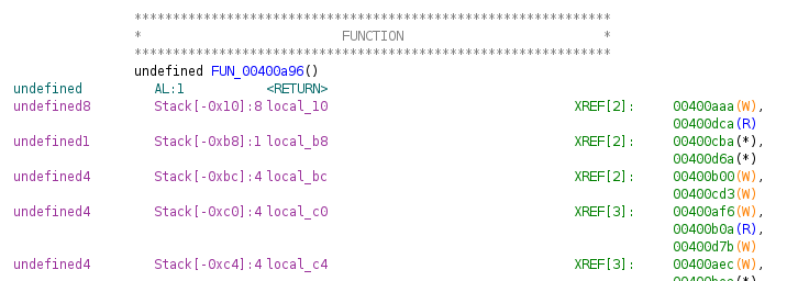 Ghidra स्थानीय चर की स्थिति के बारे में जानकारी के लिए बफर ओवरफ्लो के लिए ऑफसेट खोजने में बहुत उपयोगी है।