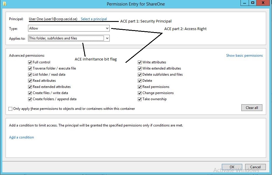 Kila ACE ina taarifa muhimu kama nani sheria inahusiana nayo (kwa kutumia Utambulisho wa Usalama au SID), ni nini sheria inaruhusu au kukataa (kwa kutumia mask ya ufikiaji), na jinsi inavyorithiwa na vitu vingine.