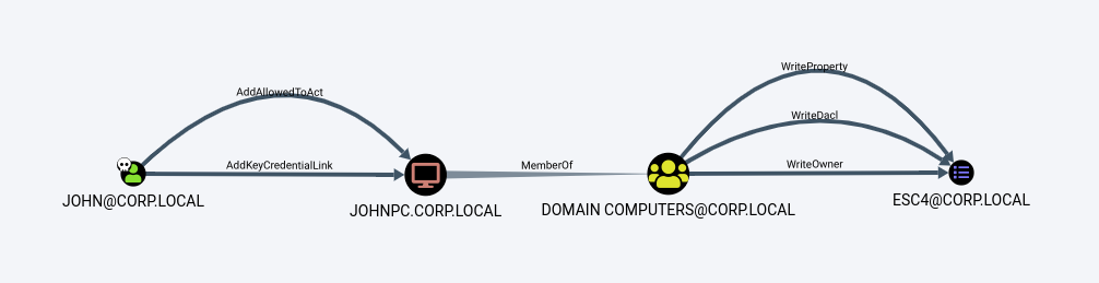 Yukarıdaki yolda gördüğümüz gibi, sadece JOHNPC bu ayrıcalıklara sahip, ancak kullanıcı JOHN'un JOHNPC'ye yeni bir AddKeyCredentialLink edge'i var. Bu teknik sertifikalarla ilgili olduğundan, bu saldırıyı da uyguladım; bu saldırı Shadow Credentials olarak biliniyor. İşte kurbanın NT hash'ini almak için Certipy’s shadow auto komutunun küçük bir önizlemesi.