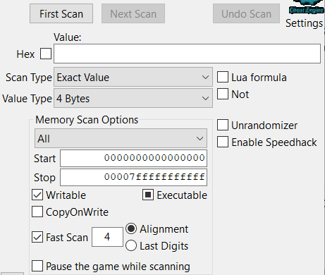 In Edit --> Settings --> Hotkeys you can set different hotkeys for different purposes like stopping the game (which is quiet useful if at some point you want to scan the memory). Other options are available: