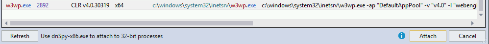 Zatim odaberite w3wp.exe da se povežete sa IIS serverom i kliknite na attach: