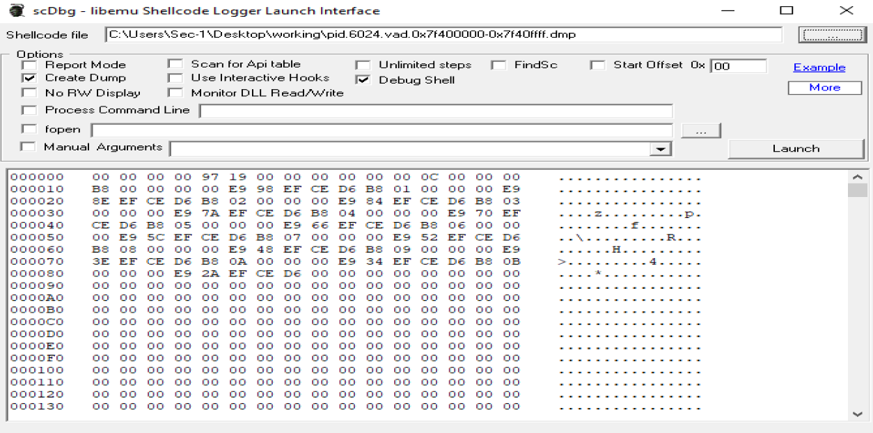 scDbg takođe ima grafički pokretač gde možete odabrati opcije koje želite i izvršiti shellcode