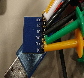 Koppel die EEPROM geheue met die CH341a Programmer en steek die toestel in die rekenaar. Indien die toestel nie gedetecteer word nie, probeer om bestuurders op die rekenaar te installeer. Maak ook seker dat die EEPROM in die regte oriëntasie gekoppel is (gewoonlik, plaas die VCC Pen in omgekeerde oriëntasie teen die USB-konnektor) anders sal die sagteware nie die chip kan opspoor nie. Verwys na die diagram indien nodig: