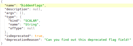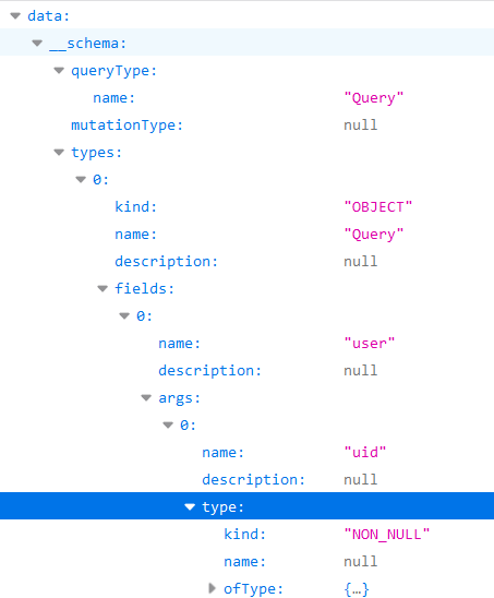 खैर, हम पहले से ही जानते थे कि, Basic Enumeration अनुभाग में एक क्वेरी प्रस्तावित की गई थी जो हमें सभी आवश्यक जानकारी दिखा रही थी: query={__schema{types{name,fields{name, args{name,description,type{name, kind, ofType{name, kind}}}}}}}