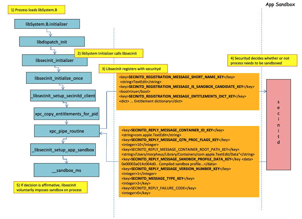 然后,libSystem.B 将调用其他几个函数,直到 xpc_pipe_routine 将应用程序的权限发送到 securityd。Securityd 检查该进程是否应该在沙箱内被隔离,如果是,它将被隔离。