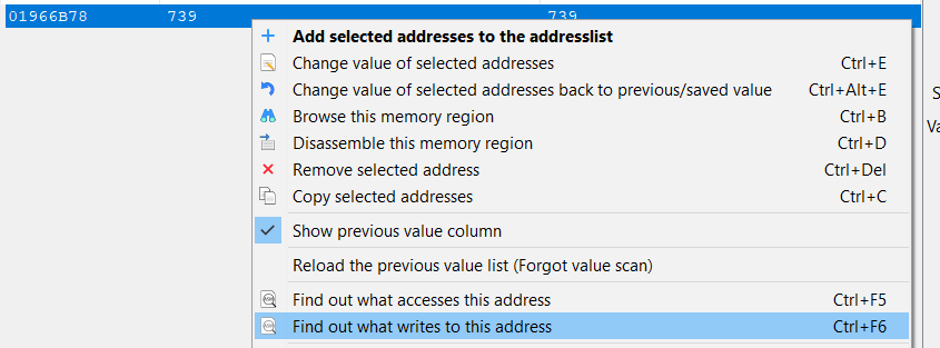 Używając niektórych z wymienionych sztuczek, znajdź adres, w którym twoja aktualna gra przechowuje ważną wartość. Następnie (zatrzymując grę, jeśli chcesz) kliknij prawym przyciskiem na znaleziony adres i wybierz "Dowiedz się, co uzyskuje dostęp do tego adresu" lub "Dowiedz się, co zapisuje do tego adresu":